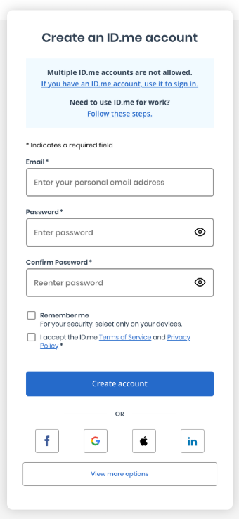 Select Create an ID.me at the start of this page. We’ll take you to the ID.me website to get started. You can follow along with the instructions here as you create your account.