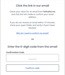 Check the inbox of the personal email address you entered to create your account. You’ll find an email from ID.me. Select Confirm your email. This will take you back to the ID.me website. Or you can enter the 6-digit code from the email on the ID.me website.